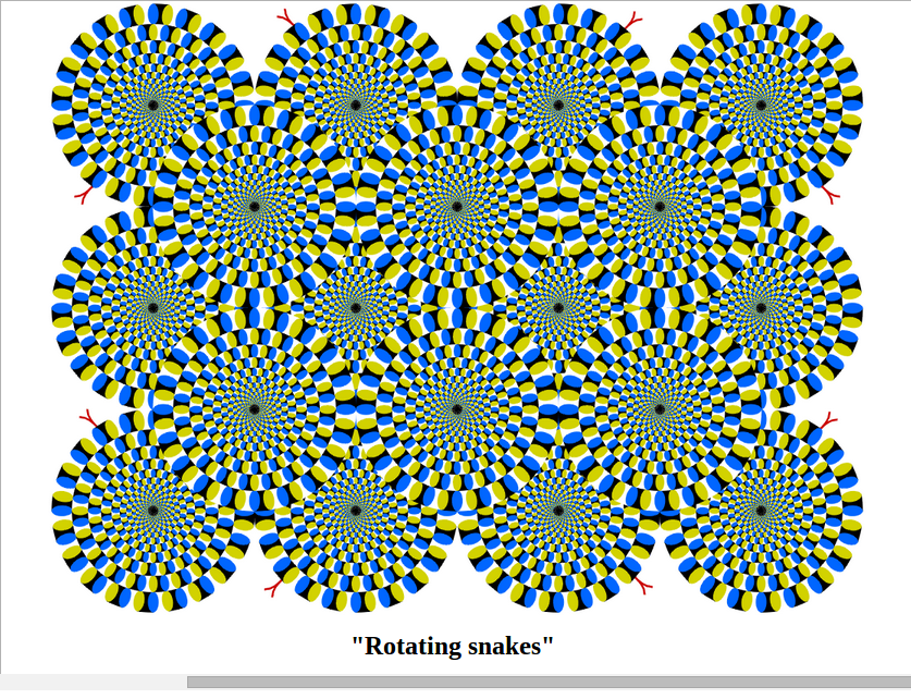 The psychologist Akiyoshi Kitaoaka works with visual illusions: objects appear to shift and move as the sole result of color changes. This trick of perception, here specifically a “peripheral drift illusion” is a visual example of what many poems do. Perception is our application of meaning on to what we sense through our eyes, ears, skin and tongue. In this perceptual illusion, this shift in color, using our natural inclination to use black lines to define shape, we latch onto the black, and then the change to lighter colors, pulls our vision forward, so that the circles appear to spin. In poetry, we are drawn forwards with our natural inclination to make meaning, and when a leap is made to unexpected imagery, there occurs a shape-shifting, mysterious voices, whirling and tilting. We are caught and pushed into perpetuating the illusion.